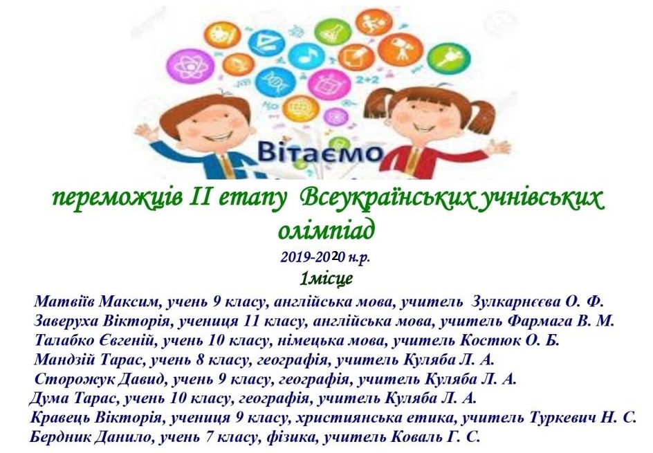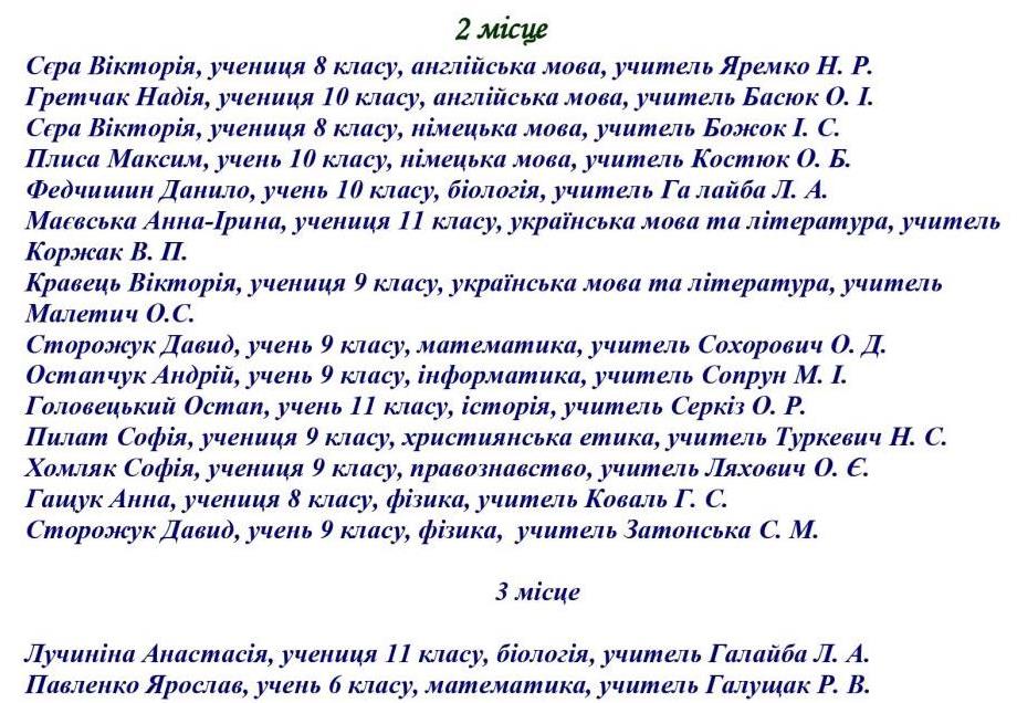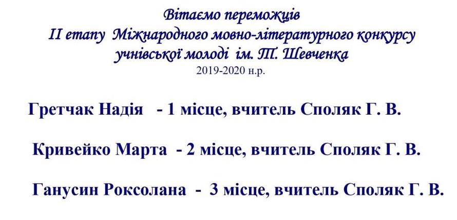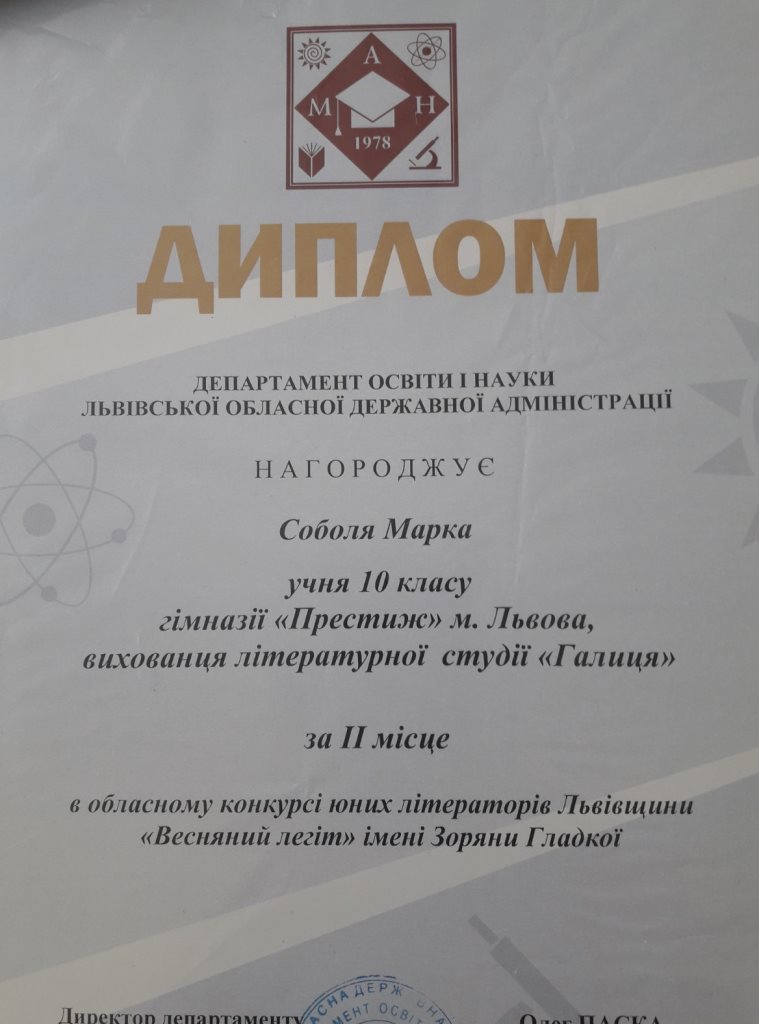 - Соболь Марко, учень 10 класу, нагороджений дипломом за ІІ місце в обласному конкурсі юних літераторів Львівщини «Весняний легіт» імені Зоряни Гладкої.