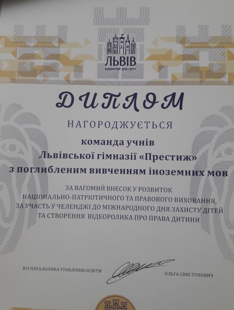 - Команда учнів гімназії відзначена за участь у челенджі до Міжнародного дня захисту дітей та створення відеоролика про права дитини.
